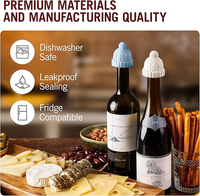 - LEAKPROOF AND SAFE. This silicone wine stopper reliably seals the bottle, making it airtight and preventing the wine itself or its volatile aromas from escaping. Silicone bottle caps are a particularly good choice in that they are flexible and can fit different bottles. These cute wine stoppers can also act as champagne stoppers: keep the bubbles in! The material that each wine plug in the set is made of is also food grade, BPA-free, and dishwasher-safe: healthy and convenient!