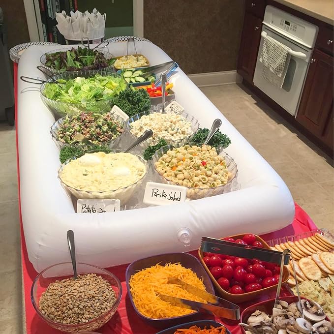 - Convenient Cooler - Keep food and drinks cool and fresh for hours by filling ice into it. This serving bar is convenient, inflatable and portable.