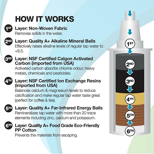 - Produces natural alkaline water with pH levels up to 9 when measured with a calibrated digital pH meter such as the Aper pH20. Test strips are not accurate for drinking water
