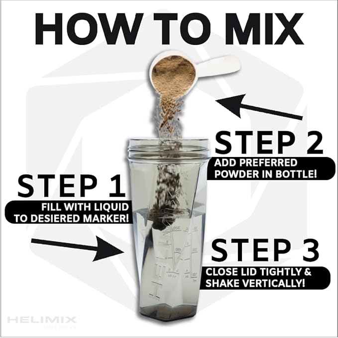 - Helimix Shaker Bottle: A gym essential for every workout. No need for a shaker ball or whisk, just shake and blend for a perfect protein shake. Perfect for pre workout, post workout and intra workout supplements.