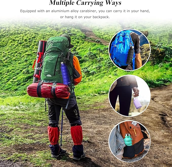 - 【PERFECT FOR TRAVEL & SPORTS】The shatter-proof, flexible and durable collapsible silicone water bottle equipped with a aluminium alloy carabiner, you can hook it to backpack or gym bag, carry it everywhere. Ideal for travel, gym, bikes, running, camping, fishing, hiking, climbing, yoga, beach, outdoor sports.