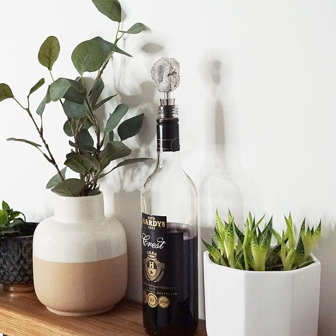 - 🍾 NATURAL: Our agate crystal is sourced from South America and is 100% natural quartz. Each geode is completely unique in shape, color and size. Our wine stopper is a practical yet decorative kitchen, bar or drinks trolley accessory for your home.