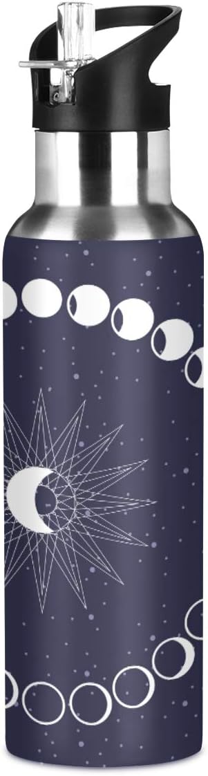 Moon Phases Circle Water Bottle with Straw Lid for Fitness Gym Camping Outdoor Sports, Wide Mouth Vacuum Insulated 18/8 Stainless Steel, 22 oz