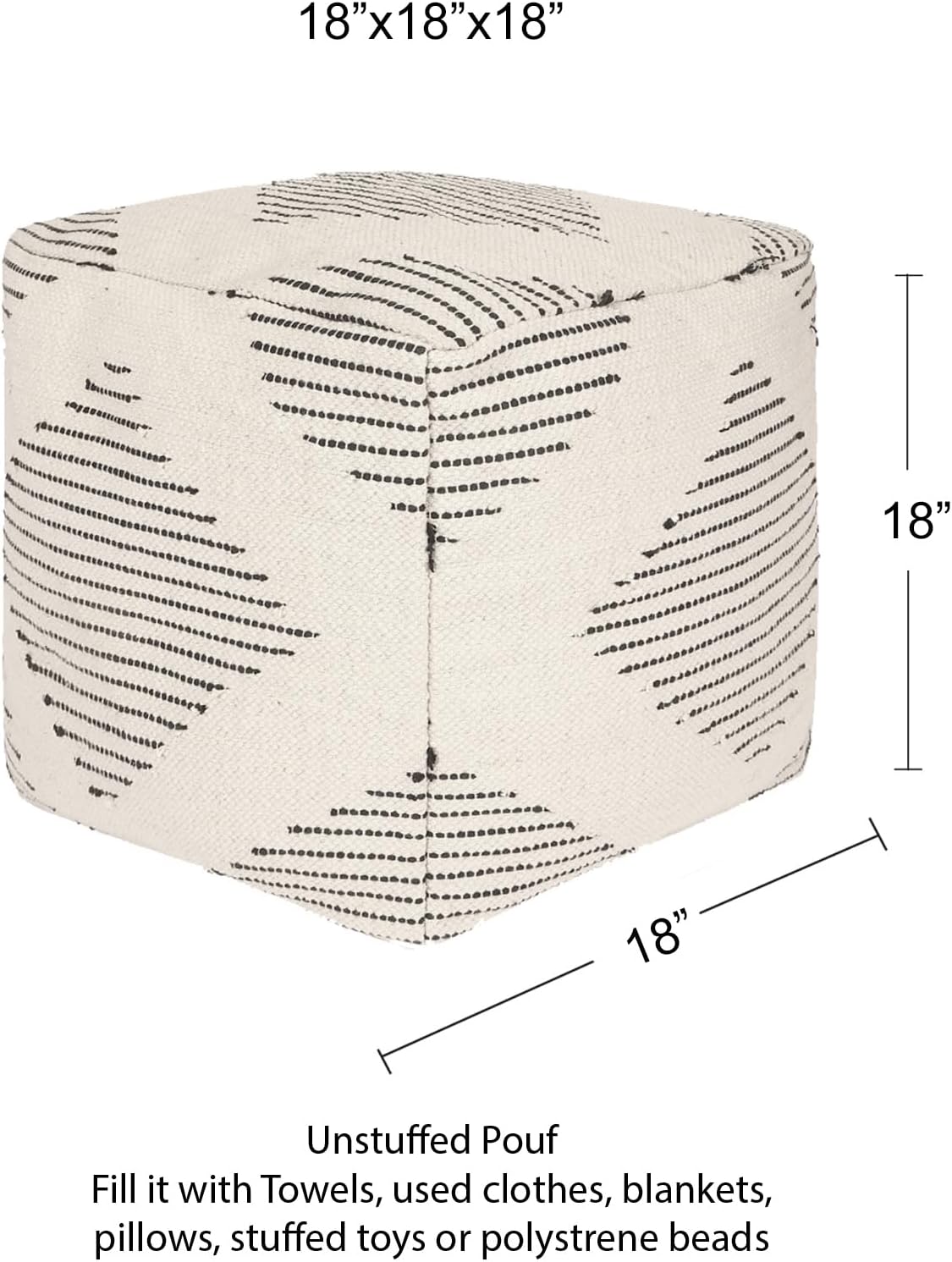 - HANDMADE FROM THE FINEST MATERIALS: The material of this eye-catching UNSTUFFED farmhouse pouf cover is made from 100% cotton. Each textured floor cube pouf ottoman cover measures 16"x16"x16" before stuffing and expands to 18"x18"x18" after stuffing. This is a decorative cover only and requires stuffing or filling. The foot stool can be filled with sheets, blankets, towels, used clothes, pillows, polystyrene beads as per convenience. it's a great way to reduce clutter or store seasonal products!