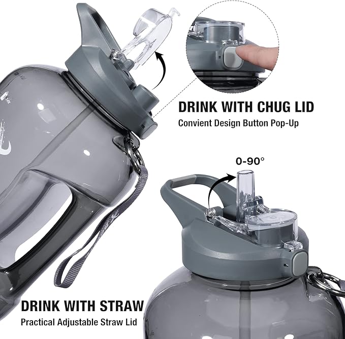 - Functional Design: 1 gallon water bottle with 2 in 1 Lid, you can sip from a straw or chug without replacing the lid. 4’’ wide mouth opening accommodates ice cubes and refill water easily.