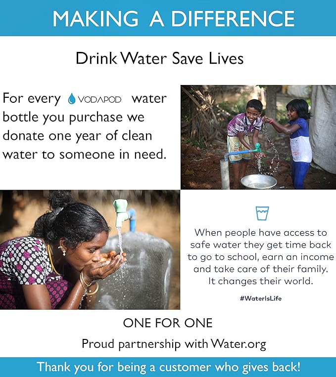 - 💧Drink Water, Give Water & Change Lives – Give the gift of water! With each VODAPOD bottle sold, we will donate one year of access to safe water to one person in the developing world. By hydrating with a VODAPOD bottle you’ll be making a difference in the life of someone less fortunate.