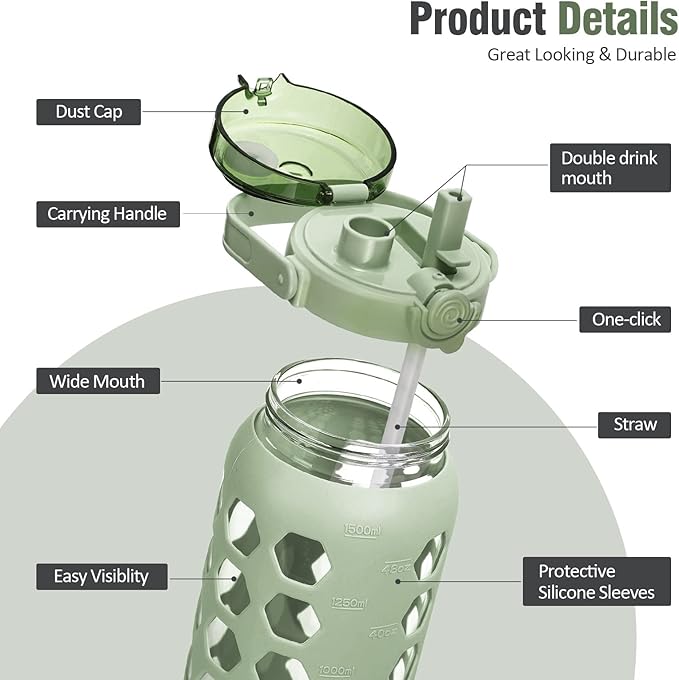 MUKOKO 56oz Glass Water Bottles with Straw and Lid,Motivational Water Jug with Time Marker Reminder and Silicone Sleeve,100% Leakproof BPA Free Fitness Sports Large Bottle-Green