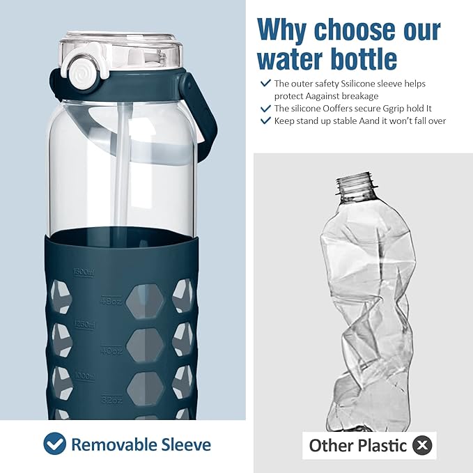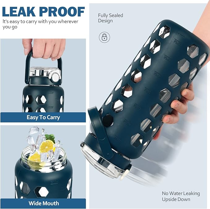 MUKOKO 56oz Glass Water Bottles with Straw and Lid,Motivational Water Jug with Time Marker Reminder and Silicone Sleeve,100% Leakproof BPA Free Fitness Sports Large Bottle-Blue