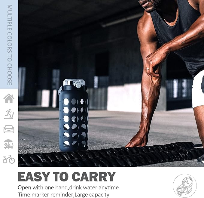 - MULTI FUNCTION:Portable large water bottle perfect for traveling, camping, running, biking and outdoor activities. Big water bottle with Silicone Sleeve comes with multiple vibrant colors,making it an ideal Mother's Day gift or any holiday.