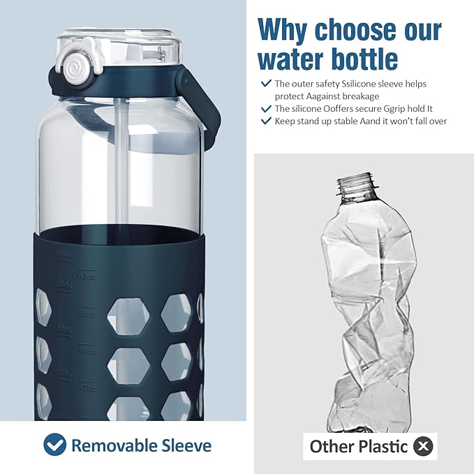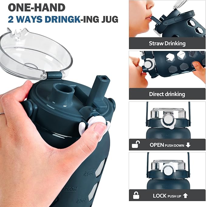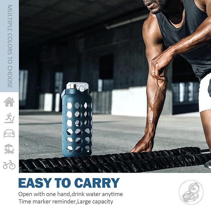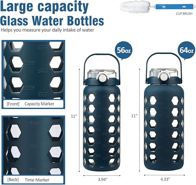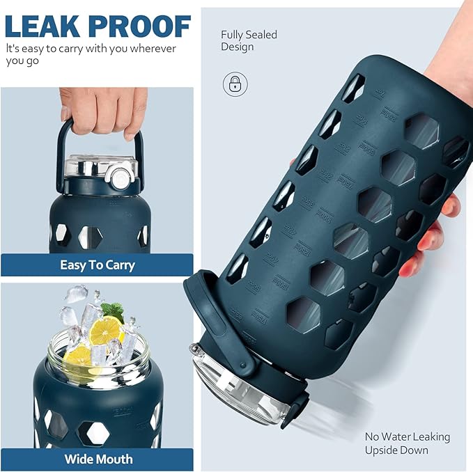 MUKOKO Half Gallon/64 oz Glass Water Bottles with Straw and Lid,Motivational Water Jug with Time Marker Reminder and Silicone Sleeve,100% Leakproof BPA Free Fitness Sports Large Bottle-Blue
