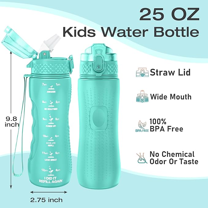 OLDLEY Kids Water Bottle for School, 25 oz (Straw Lid) BPA-Free Reusable Leak-proof Durable Tritan Plastic Water Bottles with One-handed Opening Straw Lids, Anti-dust Spout Cover (Mint Green)