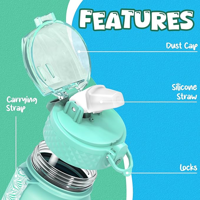- Safe Design: Features a flip-up straw with a silicone bite valve and slow flow opening for gentle hydration.