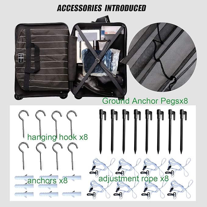 - 100% Satisfied Service:Include-1x Mosquito Net, Ground Anchor Pegsx8,hanging hook x8 + anchors x8,ropex8.If there is any questions please feel free to contact with us, our customer service team will response in 24 hours. If there is any part missing or damaged during shipping, please contact us first, we will solve the problem as the way you want.