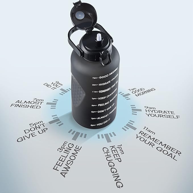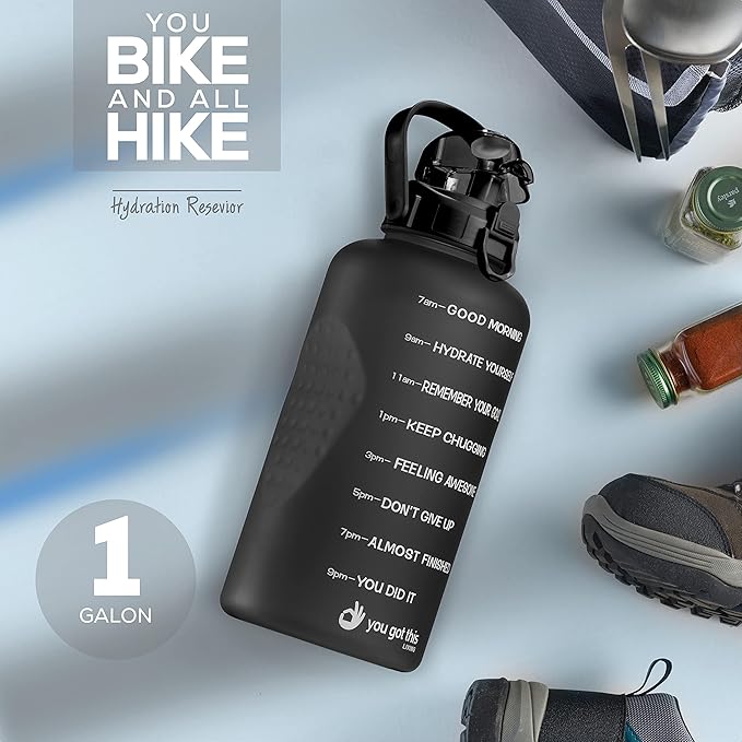 - ALL-DAY HYDRATION The One-gallon water bottle with motivational quotes by the hour keeps you hydrated throughout the day and your daily water intake on track at home, gym, or while you travel