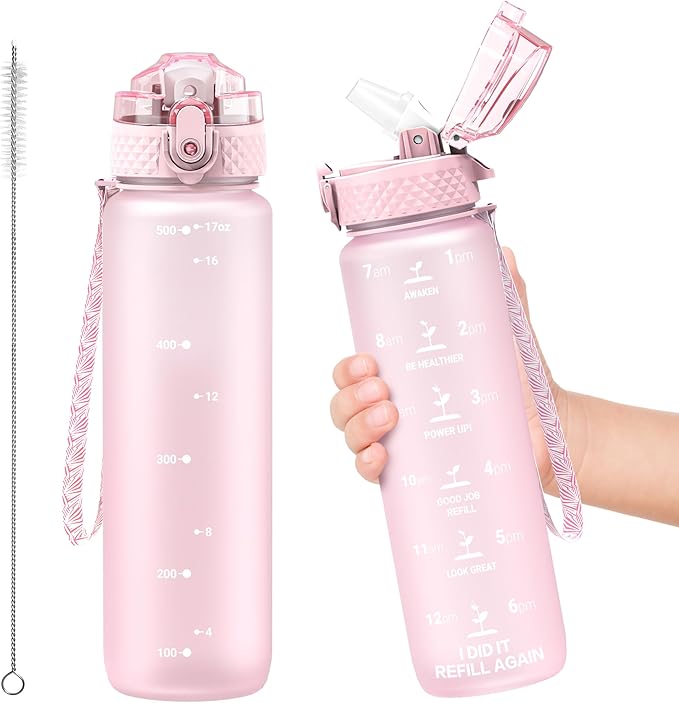 OLDLEY Kids Water Bottle for School, 17 oz (Straw Lid) BPA-Free Reusable Leak-proof Durable Tritan Plastic Water Bottles with One-handed Opening Straw Lids, Anti-dust Spout Cover (Pink)