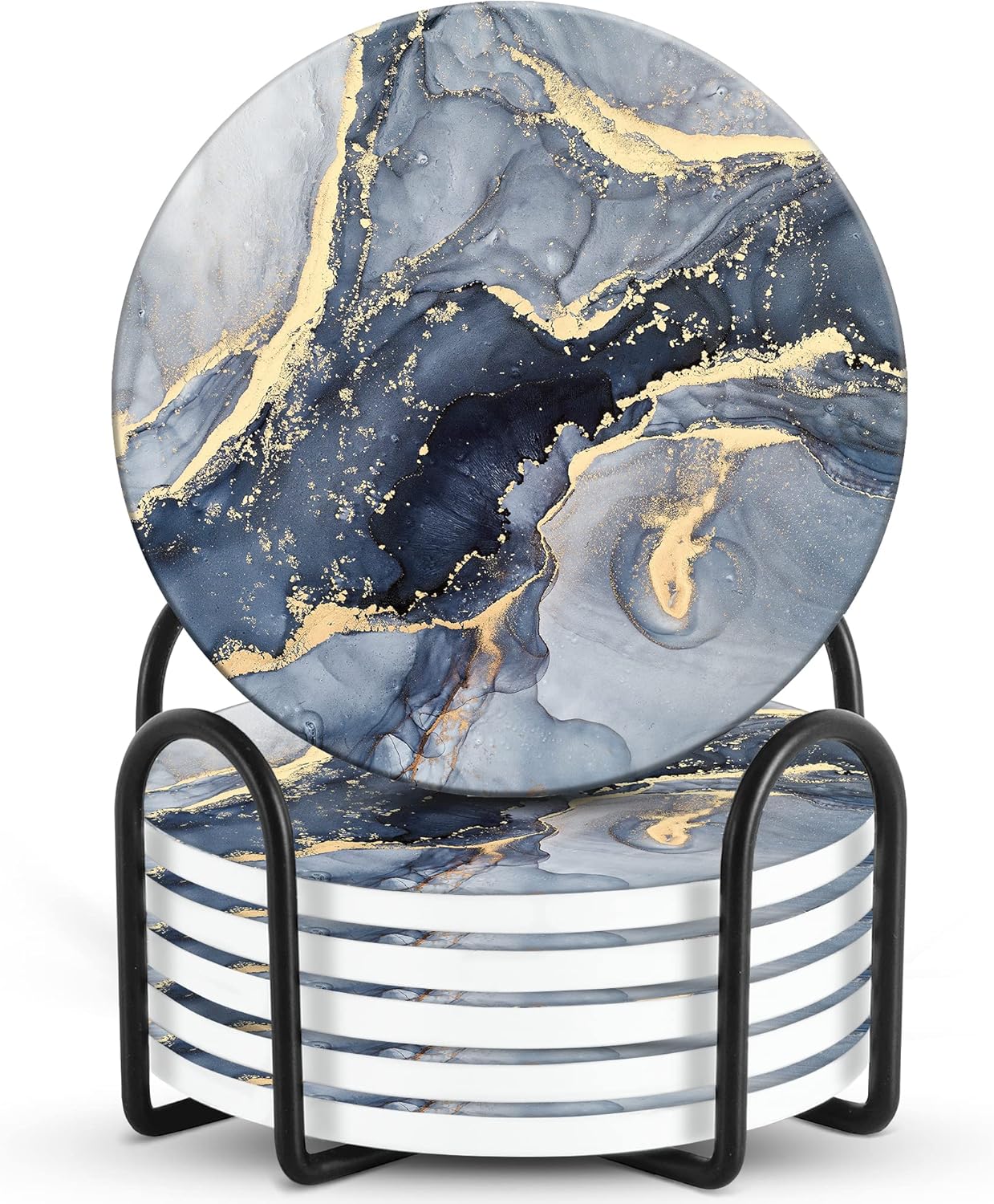 Emerson Coasters for Drinks Absorbent – Saucers Coffee Table Set of 6 with Holder, Wooden Tabletop Protection Marble Style 100% Ceramic - Non-Slip & Cork Bottom - Heavy Duty Drink Coasters (Riptide)