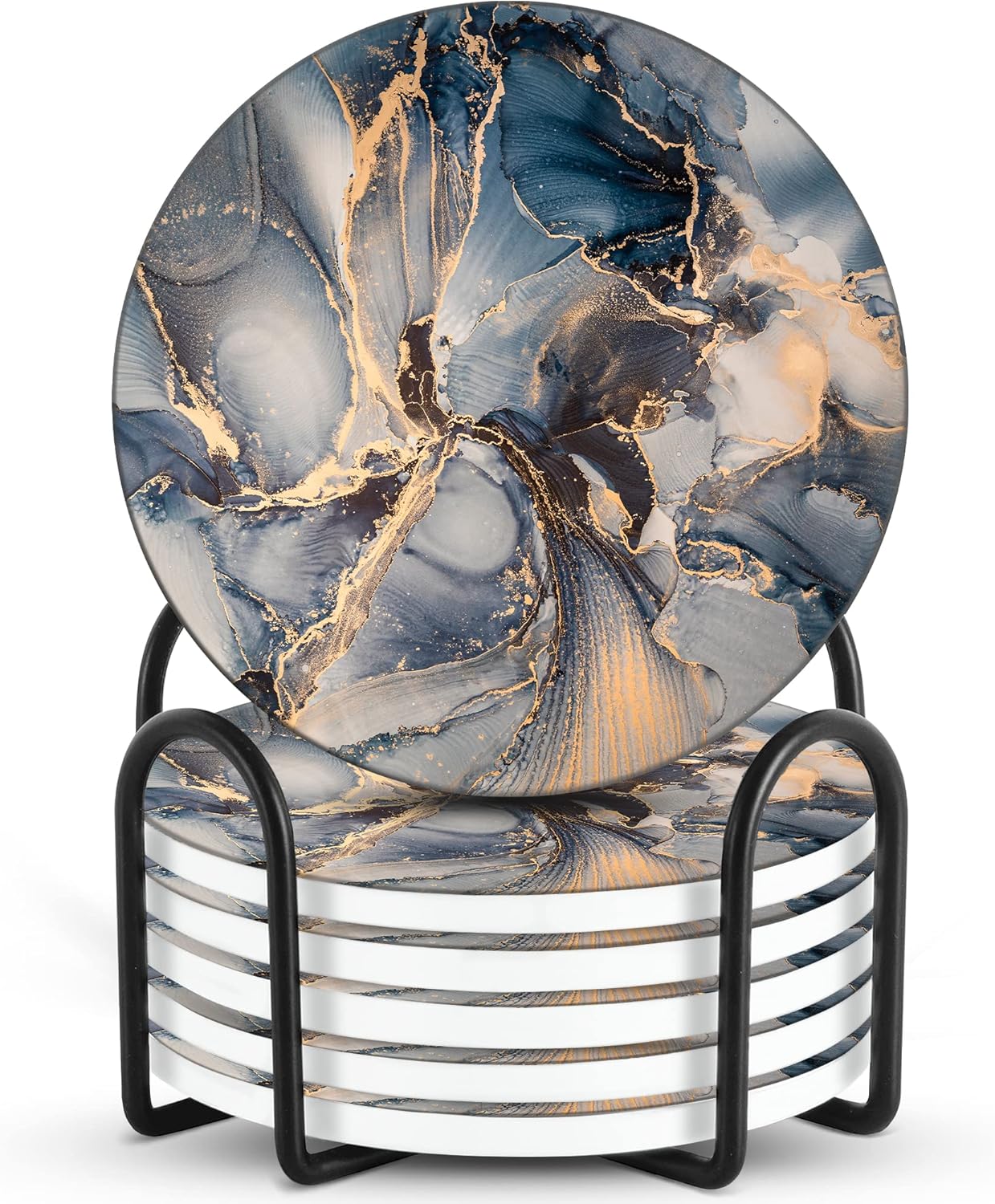 Emerson Coasters for Drinks Absorbent – Natural Stone Drink Coasters Set with Holder, Coasters for Coffee Table, Wooden Tabletop Protection Marble Style – 100% Heavy Duty Set of 6 (Atlas)