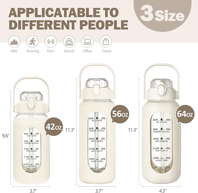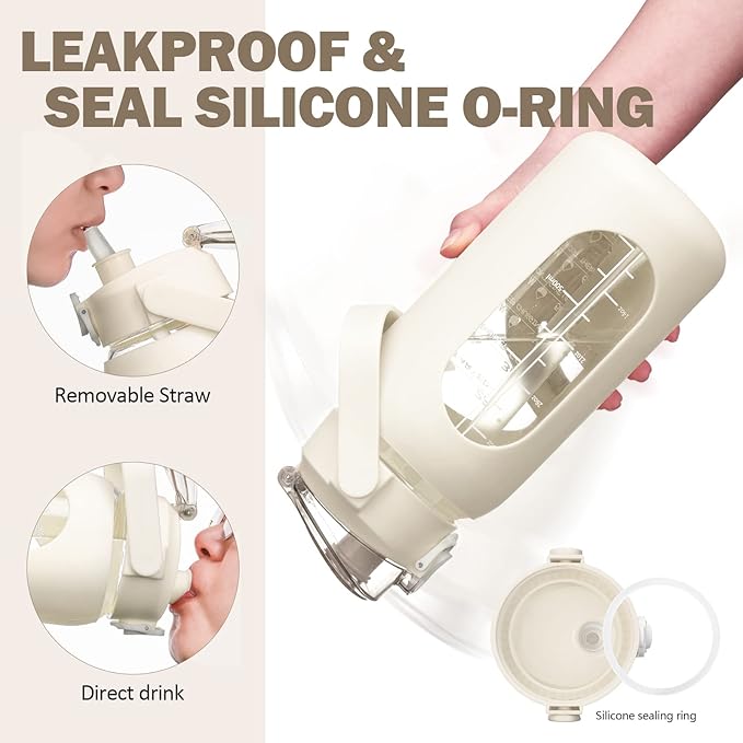 - ❤High-Quality Borosilicate Glass Bottle- This large motivationla water bottle is made of odorless, quality, borosilicate glass. Straw and lid are made of food-grade PP, BPA-free and eco-friendly.