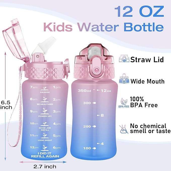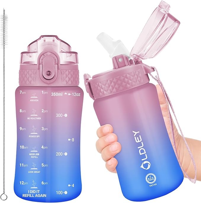 OLDLEY Kids Water Bottle for School, 12 oz (Straw Lid) BPA-Free Reusable Leak-proof Durable Tritan Plastic Water Bottles with One-handed Opening Straw Lids, Anti-dust Spout Cover (Pink-Blue)