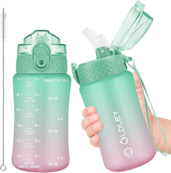 OLDLEY Kids Water Bottle for School, 12 oz (Straw Lid) BPA-Free Reusable Leak-proof Durable Tritan Plastic Water Bottles with One-handed Opening Straw Lids, Anti-dust Spout Cover (Mintpink)