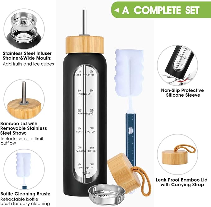 - Infuse Your Beverage - Use the stainless-steel infuser to strain fruits or herbs in our reusable glass water bottle 32oz with time marker for a delicious and healthy way to flavor your water. Silicone sleeve adds style and provides protection from slips and falls.