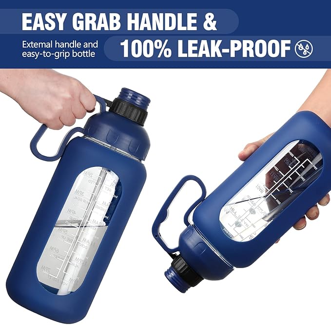 - UNIQUE HANDLE DESIGN&PORTABLE-The 64 oz glass water bottle with sturdy wide handle, the handle size fits your hand perfectly. A dual-purpose water bottle has removable straw that can be used for fast water flow or spill-proof sipping. Our dustproof and leakproof flip-top cap can better keep clean, ensuring you drink healthy.