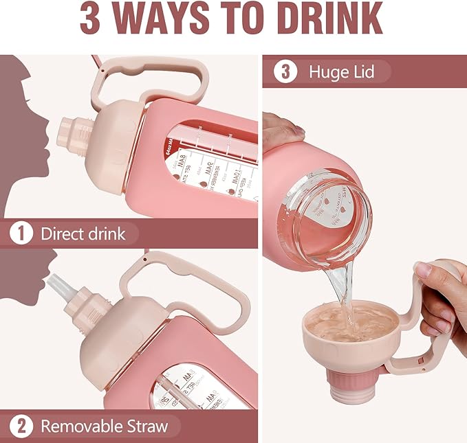 MUKOKO 64oz Glass Water Bottles with Straw, Half Gallon Water Bottle with Time Marker, Motivational Water Bottle with Silicone Sleeves,Large Glass Water Bottle for Gym,Working,Outdoor,Pink