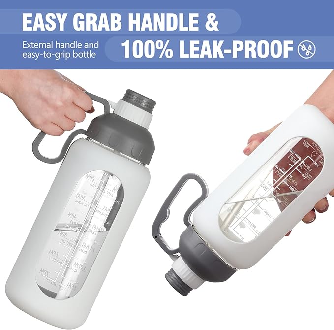 - UNIQUE HANDLE DESIGN&PORTABLE-The 64 oz glass water bottle with sturdy wide handle, the handle size fits your hand perfectly. A dual-purpose water bottle has removable straw that can be used for fast water flow or spill-proof sipping. Our dustproof and leakproof flip-top cap can better keep clean, ensuring you drink healthy.