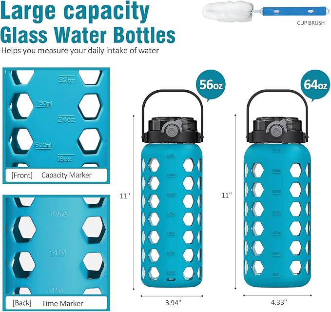 MUKOKO Half Gallon/64 oz Glass Water Bottles with Straw and Lid,Motivational Water Jug with Time Marker Reminder and Silicone Sleeve,100% Leakproof BPA Free Fitness Sports Large Bottle-Teal