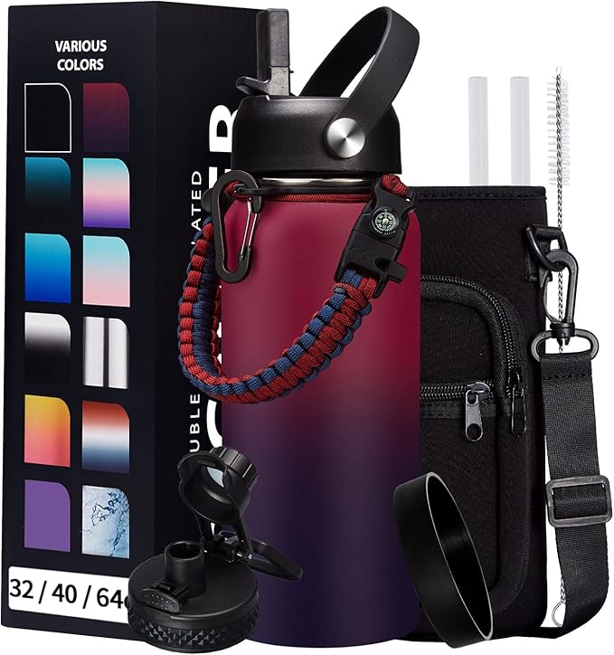- SUPER JOYFUL COMBO: Buy 32oz insulated water bottles and get 9 accessories (2 x lids, 1 x survival paracord, 1 x carrying pouch, 1 x shoulder strap, 1 x protective cup mat, 2 x straws, 1 x straw brush). WITH A LIFETIME GUARANTEE, these thermal water bottles are perfect gifts for using at home, work, school, road trips, hiking, sporting events, or just hanging out