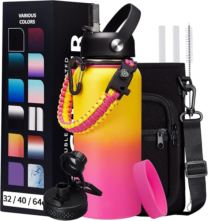 - SUPER JOYFUL COMBO: Buy 32oz insulated water bottles and get 9 accessories (2 x lids, 1 x survival paracord, 1 x carrying pouch, 1 x shoulder strap, 1 x protective cup mat, 2 x straws, 1 x straw brush). WITH A LIFETIME GUARANTEE, these thermal water bottles are perfect gifts for using at home, work, school, road trips, hiking, sporting events, or just hanging out