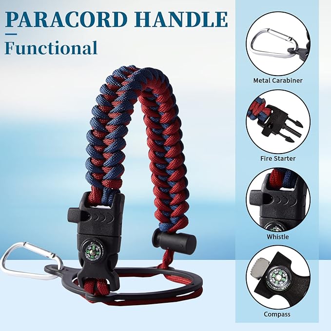 - PERSONALIZATION BOTTLE PARACORD HANDLE - Thermo water bottle with a pretty cool functional paracord handle which does more than meets the eye. The survival strap cord made of military grade nylon, with compass, safety loop, metal carabiner, flint, igniter and whistle. Can help you out if you were in a survival situation while hiking, camping or everyday life