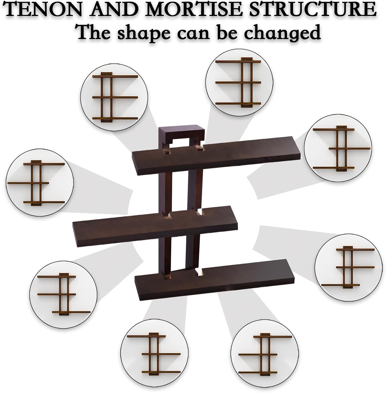 - Modifiable Design: The floating shelf wood adopts mortise and tenon construction. Simply fix the main frame to the wall and freely combine the remaining boards into eight different shapes without causing damage to the wall and avoiding aesthetic fatigue