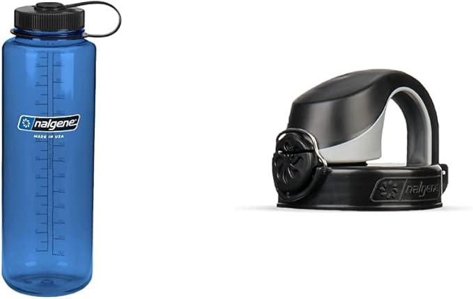Nalgene Sustain Tritan BPA-Free Water Bottle Made with Material Derived from 50% Plastic Waste, 48 OZ, Wide Mouth, Blue & On The Fly Bottle Replacement Lid (Black/Gray), 22oz
