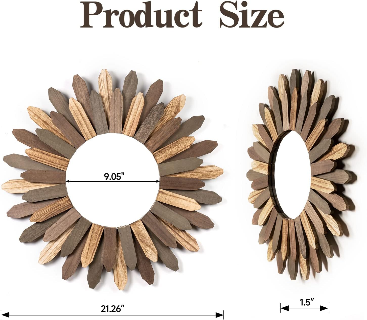 - Easy to Hang: Measure at 21 inch diameter with wood frame and diameter of 9 inch for mirror; Hang this stunning mirror in your bedroom over your bed, in your hallway or entryway, over your living room sofa.No any assembly, quite easy to hang on the wall; Comes with anchor and screw