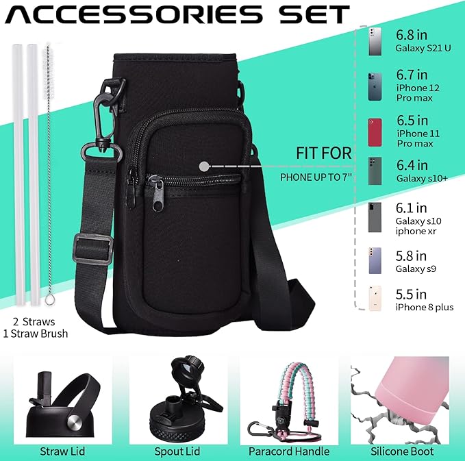 - SUPER JOYFUL COMBO: Buy 32 oz water bottles and get 9 accessories (2 x lids, 1 x survival paracord, 1 x carrying pouch, 1 x shoulder strap, 1 x protective cup mat, 2 x straws, 1 x straw brush). WITH A LIFETIME GUARANTEE, these thermal water bottles are perfect gifts for using at home, work, school, road trips, hiking, sporting events, or just hanging out