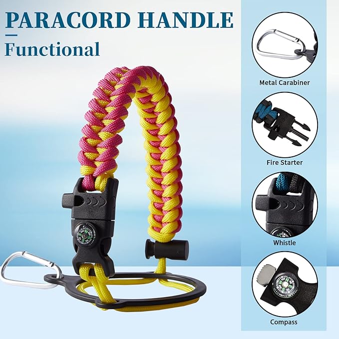 - PERSONALIZATION BOTTLE PARACORD HANDLE - Thermo water bottle with a pretty cool functional paracord handle which does more than meets the eye. The survival strap cord made of military grade nylon, with compass, safety loop, metal carabiner, flint, igniter and whistle. Can help you out if you were in a survival situation while hiking, camping or everyday life