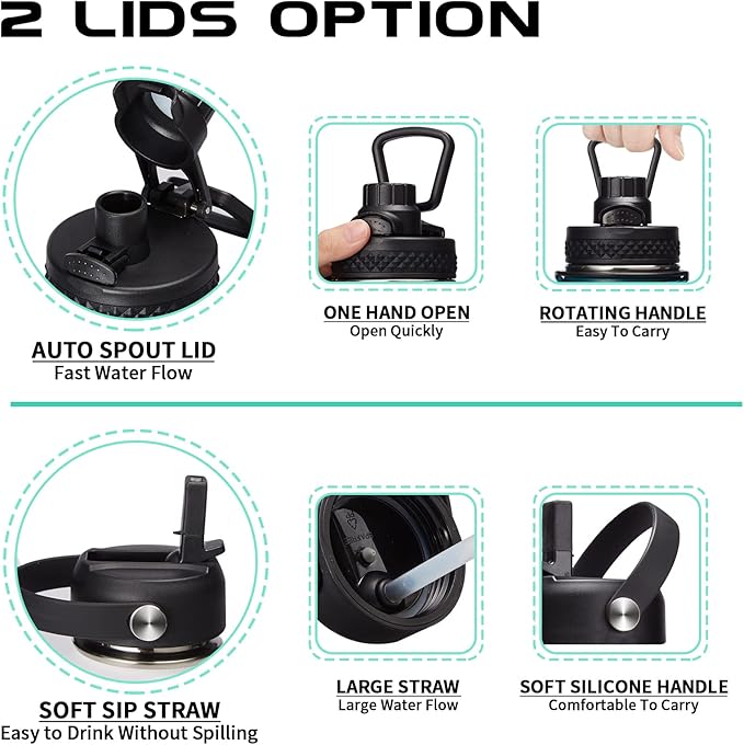 - 2 LID OPTIONS (Auto-spout & Straw): two different lids are complete LEAK PROOF & design for easy drink. The pops-up lid for easy drinking and seals shut for no leaks when you're on the go. The straw lid makes it easy to enjoy spill-proof sips, and package come with a alternative straw & a straw brush for easy cleaning