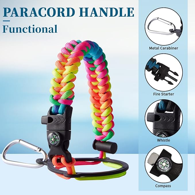 - PERSONALIZATION BOTTLE PARACORD HANDLE - Quarter gallon water bottle with a pretty cool functional paracord handle which does more than meets the eye.?The survival strap cord is made of military-grade nylon and comes with a compass, safety loop, metal carabiner, flint, igniter, and whistle, making it a functional and stylish addition to your thermo water flask, is perfect for outdoor camping, hiking, fitness enthusiasts