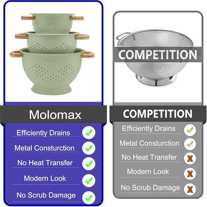 - Cool Heat-Resistant Bamboo Handles: The thoughtfully crafted bamboo handles provide a smooth and natural feel, ensuring easy maneuverability while pouring, shaking, or tossing ingredients in the colander, reducing strain on your hands and wrists.