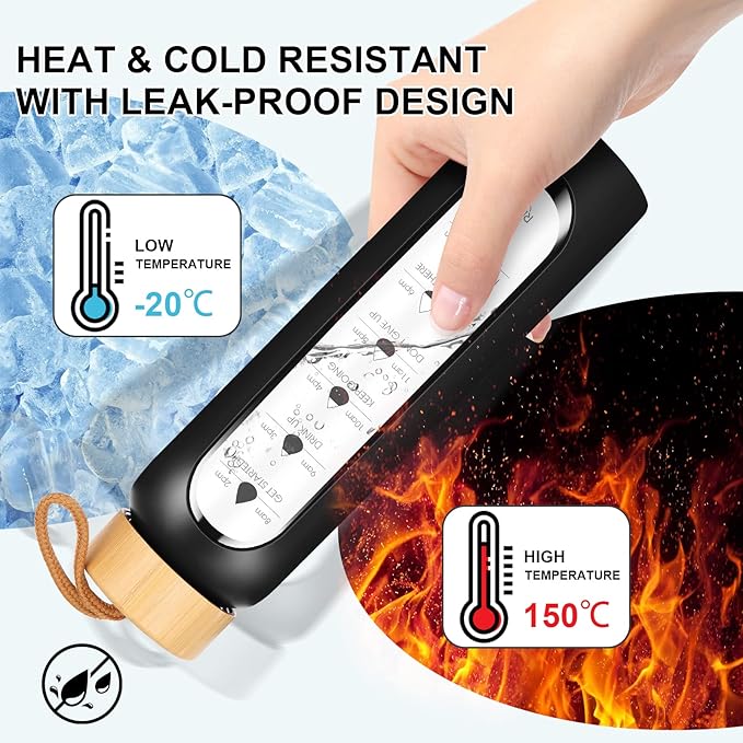 - [Your Ultimate Hydration Partner]: Our clear glass drinking bottle are made of borosilicate glass, which is dishwasher safe, leak proof, BPA, BPS, PVC, lead, and cadmium free. These durable and aesthetic reusable glass time water bottles will not crack under extreme temperature and pressure.