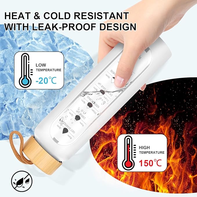 - [Your Ultimate Hydration Partner]: Our clear glass drinking bottle are made of borosilicate glass, which is dishwasher safe, leak proof, BPA, BPS, PVC, lead, and cadmium free. These durable and aesthetic reusable glass time water bottles will not crack under extreme temperature and pressure.