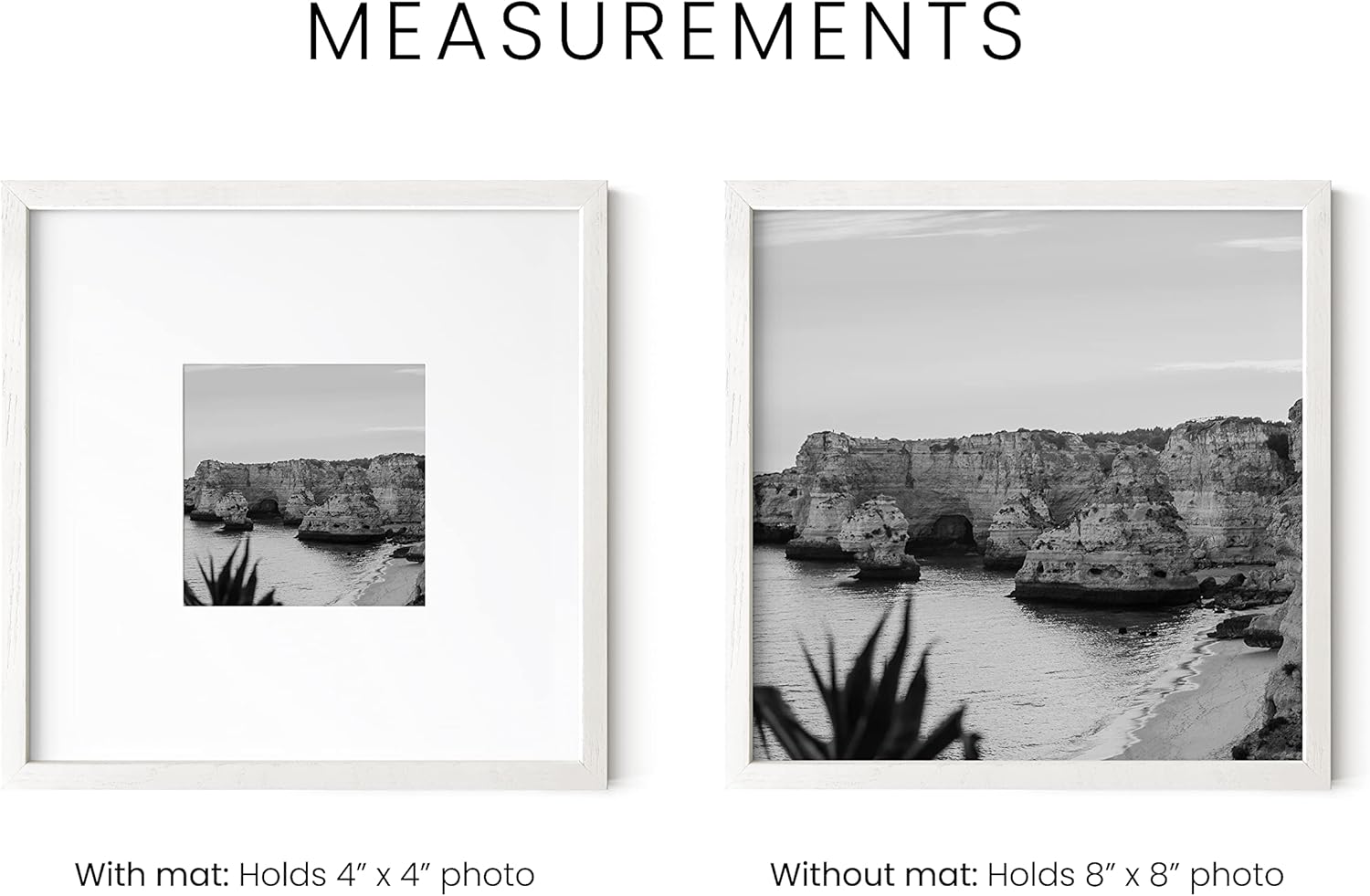 - PREMIUM QUALITY: Our 8x8 picture frames white will add the finishing touch to your art or photograph. It's equipped with plexiglass covered by protective film and two metal hangers for horizontal or vertical hanging. For added convenience, the wood grain picture frame is shipped in a durable box, guaranteeing its protection throughout transi