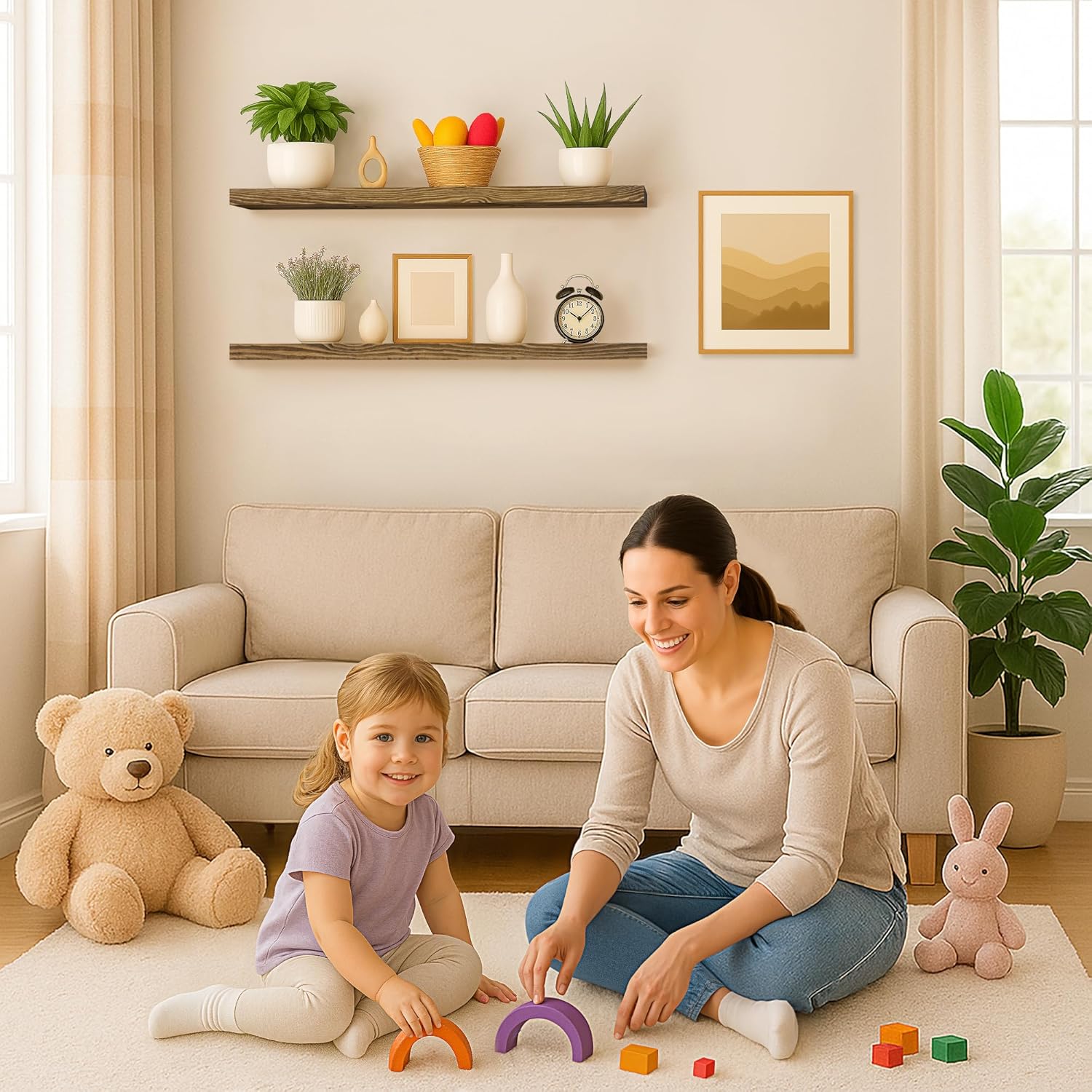 - MODERN RUSTIC LOOK - The floating shelves are made of 100% natural pine, and the wood has different nodes and grains, so the color of each shelf may be slightly different, but equally stunning