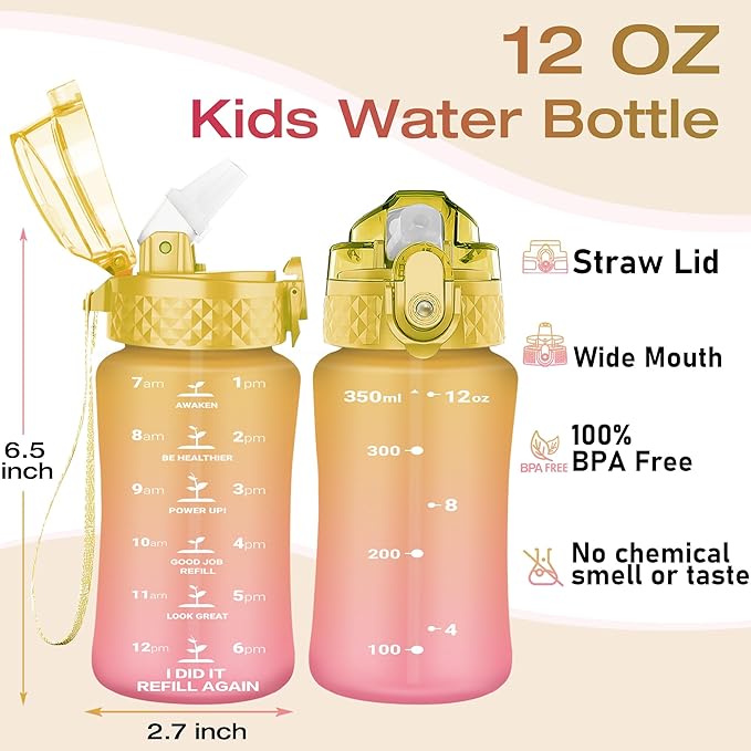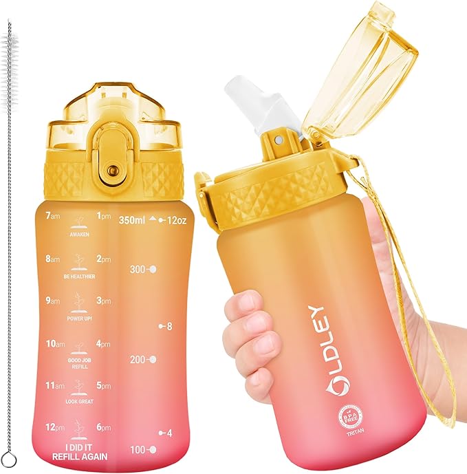 OLDLEY Kids Water Bottle for School, 12 oz (Straw Lid) BPA-Free Reusable Leak-proof Durable Tritan Plastic Water Bottles with One-handed Opening Straw Lids, Anti-dust Spout Cover (Nectarine)
