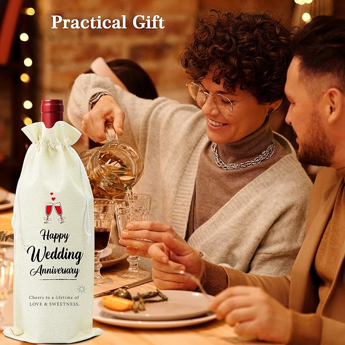 Omoojee 4 Pcs Wedding Anniversary Wine Bag, Couple Gift for Married Anniversary, Flax Drawstring Wine Bag