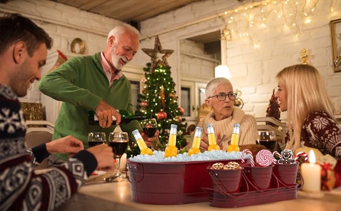 Oval Ice Bucket with 3 Serve Buckets Set - Condiments, Nuts, Ice Cream, Snacks, Candy Serving Bowls, Metal Drink Cooler Beverage Tub, Chill Wine & Beer, 4 Gallons for Home Parties, Red/Wire handle
