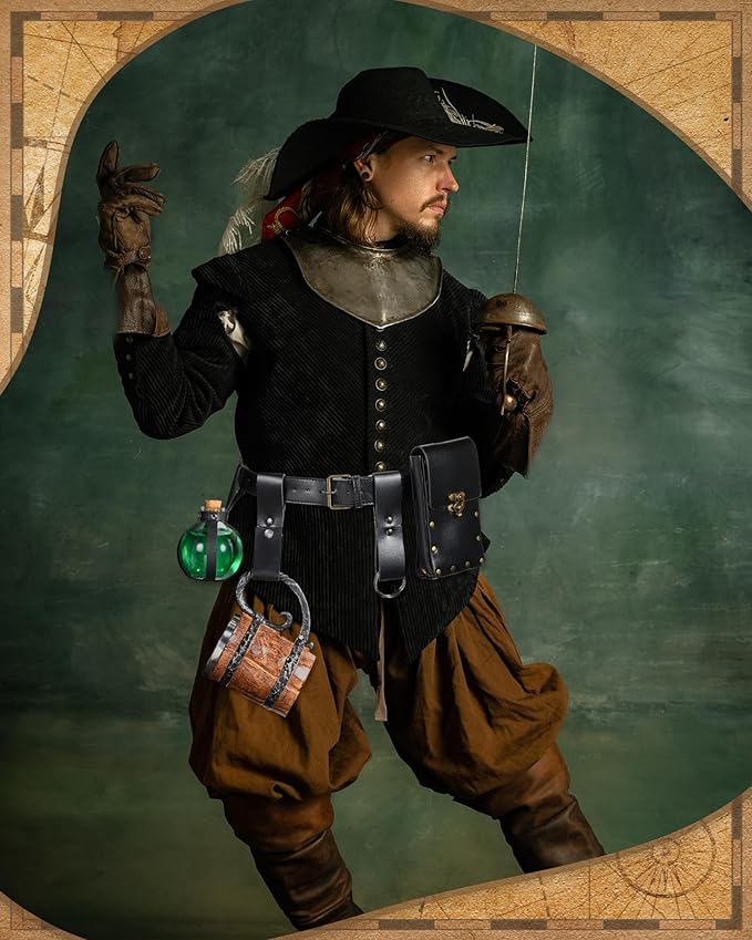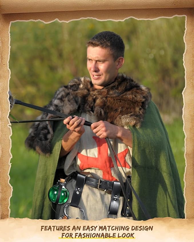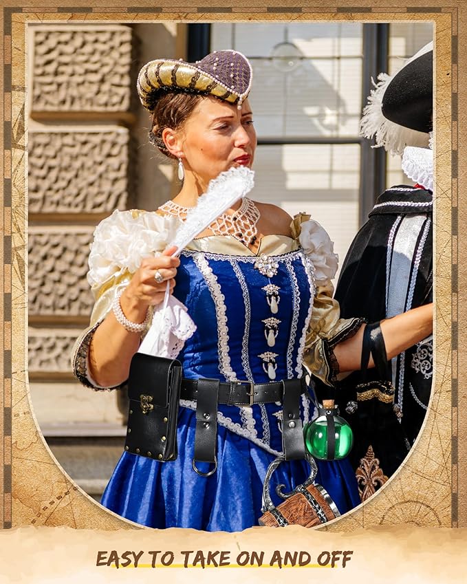 - Quality Material for a Durable and Realistic Look: the renaissance skirt hikes and mug strap are mainly made of leather and metal, soft and smooth, solid and sturdy; And the glass potion bottles are made of glass and wooden cork, thick and clear, providing you with a realistic and durable costume that looks amazing; These quality materials make them feel sturdy and hearty, so you can use them repeatedly for Halloweens to come