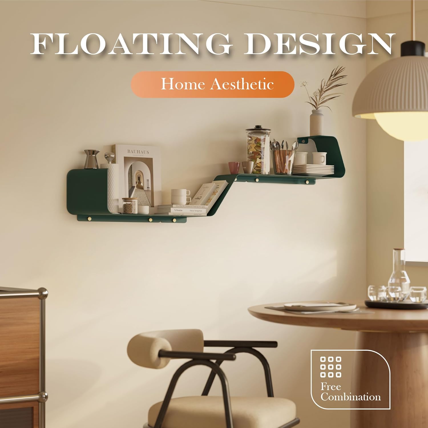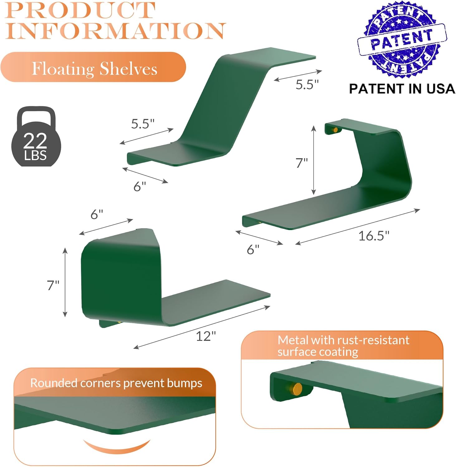 Floating Shelves, Wall Shelf, Set of 3 Wall Mounted Metal Shelves with Unique Design for Wall Storage, Book Shelf, Display Shelves for Bathroom Bedroom Kitchen Living Room for Home Green