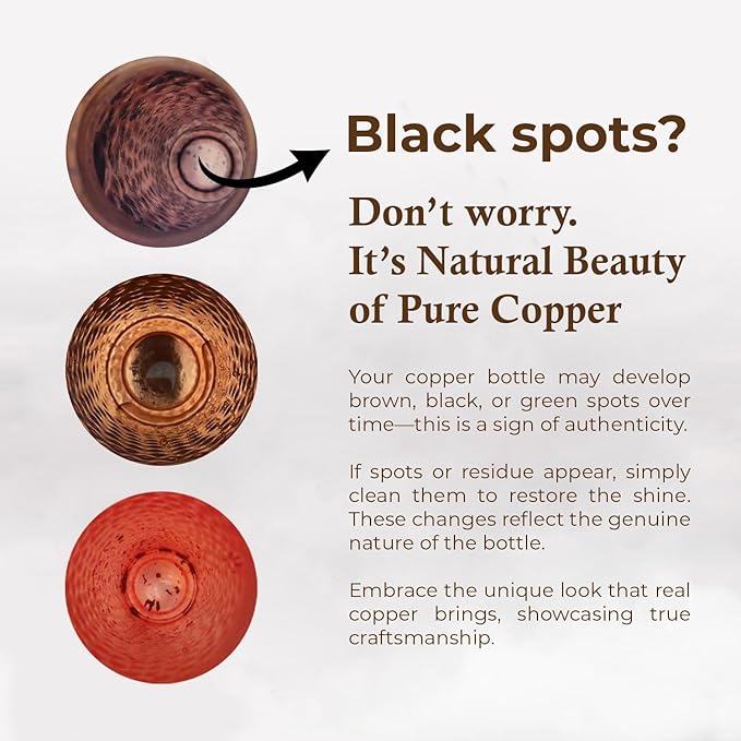 - CARE AND MAINTENANCE: Made from 100% pure copper, this bottle may develop a natural patina or black residue over time due to natural oxidation. To restore its shine from inside, clean with lemon, salt, and vinegar till all dirt cleaned out. This natural process is normal and safe, enhancing the bottle's authenticity